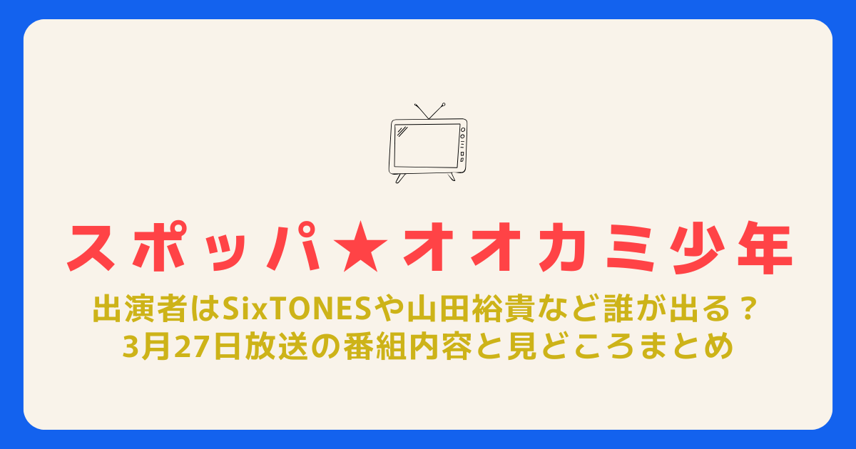 結論:スポッパ オオカミ少年は、SixTONESや山田裕貴ら豪華出演者がスポーツ企画で対決する特番で、家族でも楽しめる2時間スペシャルです。